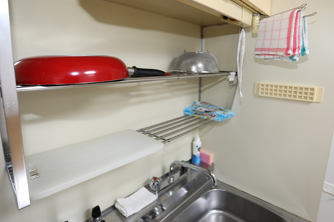 台所 冷蔵庫 電子レンジ 炊飯器 オーブントースター なべ フライパン 茶瓶 きゅうす 包丁 まな板 食器一式 食卓 いす 食器棚  ふきん アイロン アイロン台